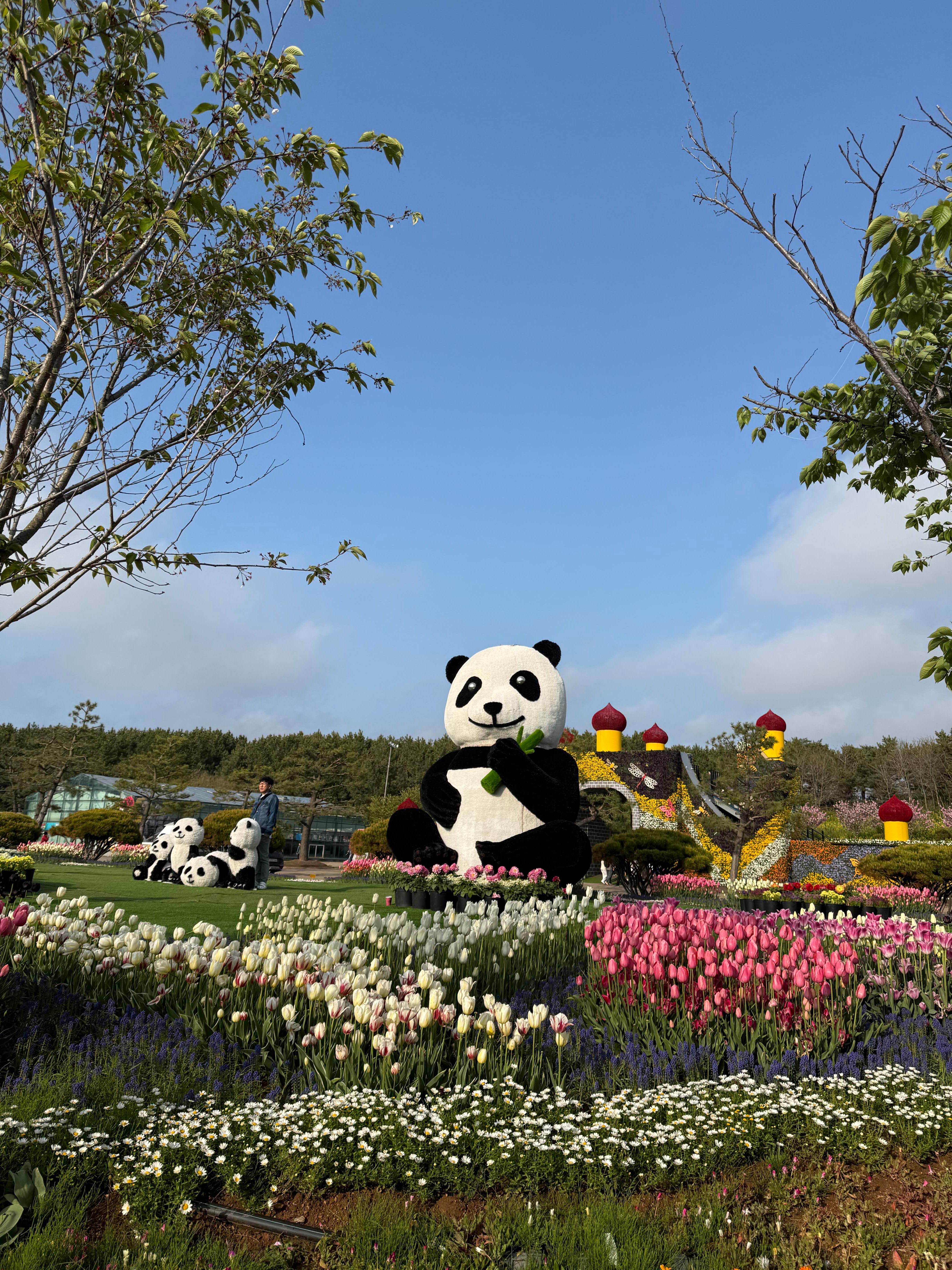 요즘 푸바오의 인기 덕분인지, 박람회장 내에는 귀여운 팬더 조형물이 설치되어 있었어요! 특히 튤립으로 장식된 팬더 조형물은 방문객들의 포토존으로 인기가 많았어요.
