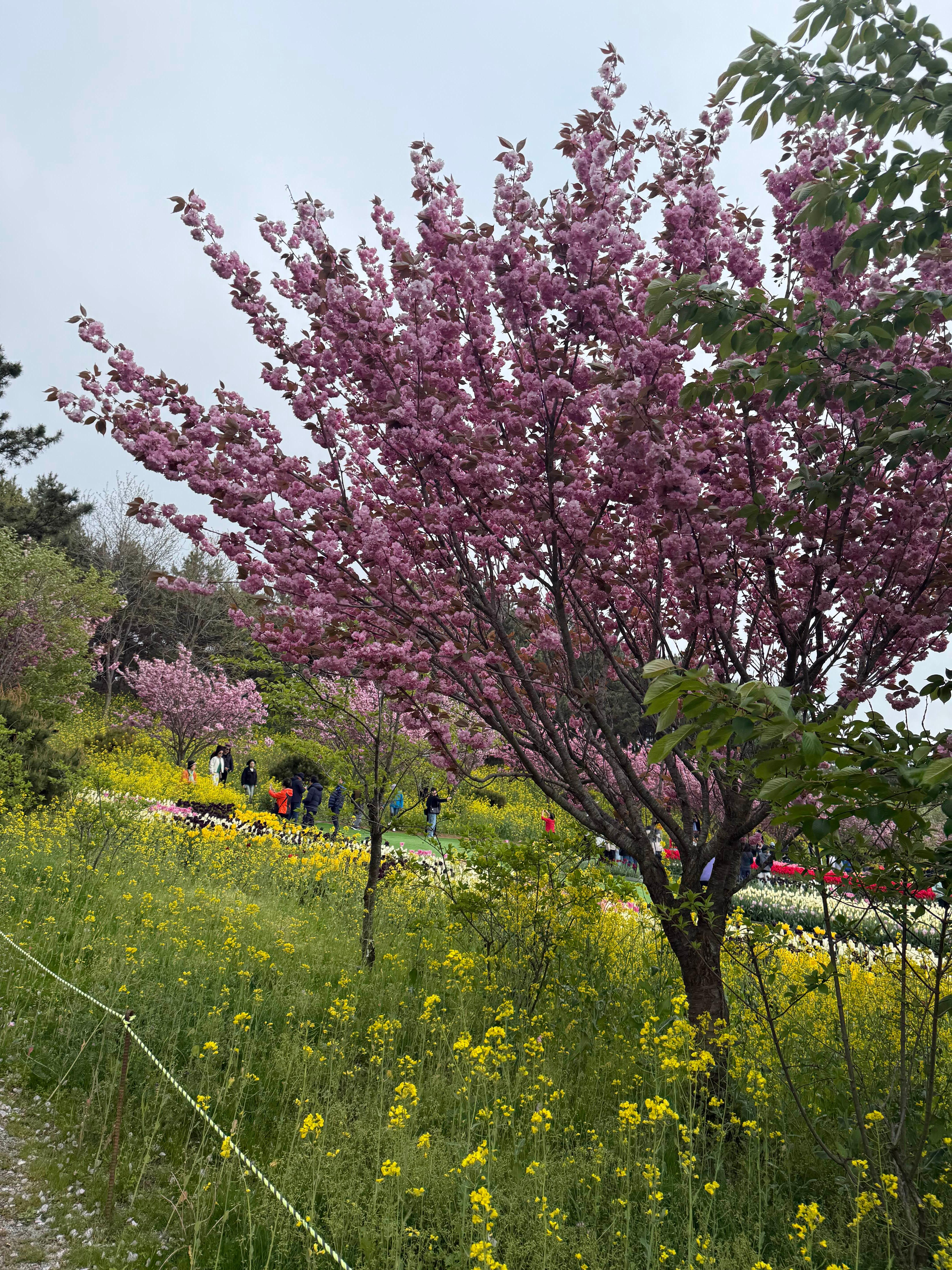 튤립만 있을 줄 알았는데, 박람회장 한쪽에는 겹벚꽃과 유채꽃이 어우러진 특별한 공간이 마련되어 있었어요! 노란 유채꽃 물결 사이로 분홍빛 겹벚꽃이 피어있는 모습이 정말 아름다웠어요. 이곳은 방문객들 사이에서 인증샷 명소로 인기가 많았어요.