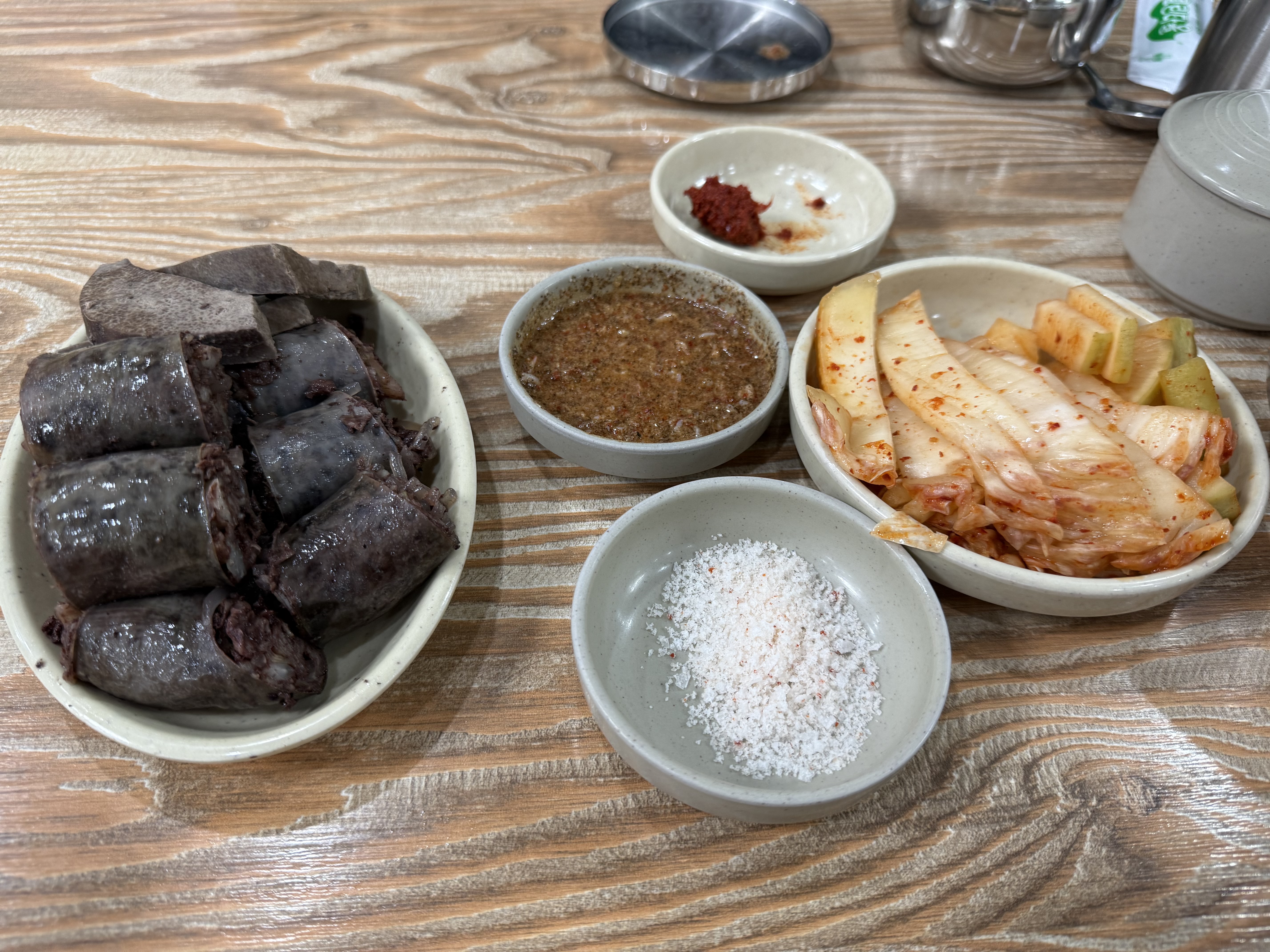 저는 순대국밥과 순대반접시를 주문했어요. 순대국밥은 기본으로 깍두기와 김치가 함께 제공되고, 들깨가루와 부추는 테이블 위에 따로 비치되어 있어 기호에 맞게 추가할 수 있어요. 국물은 뽀얗고 진한 편인데, 전혀 느끼하지 않았고 잡내가 없어서 첫 숟갈부터 마지막까지 깔끔하게 먹을 수 있었어요. 순대와 내장이 아낌없이 들어 있었고, 특히 순대 속이 꽉 차 있어서 씹는 식감이 좋았어요.