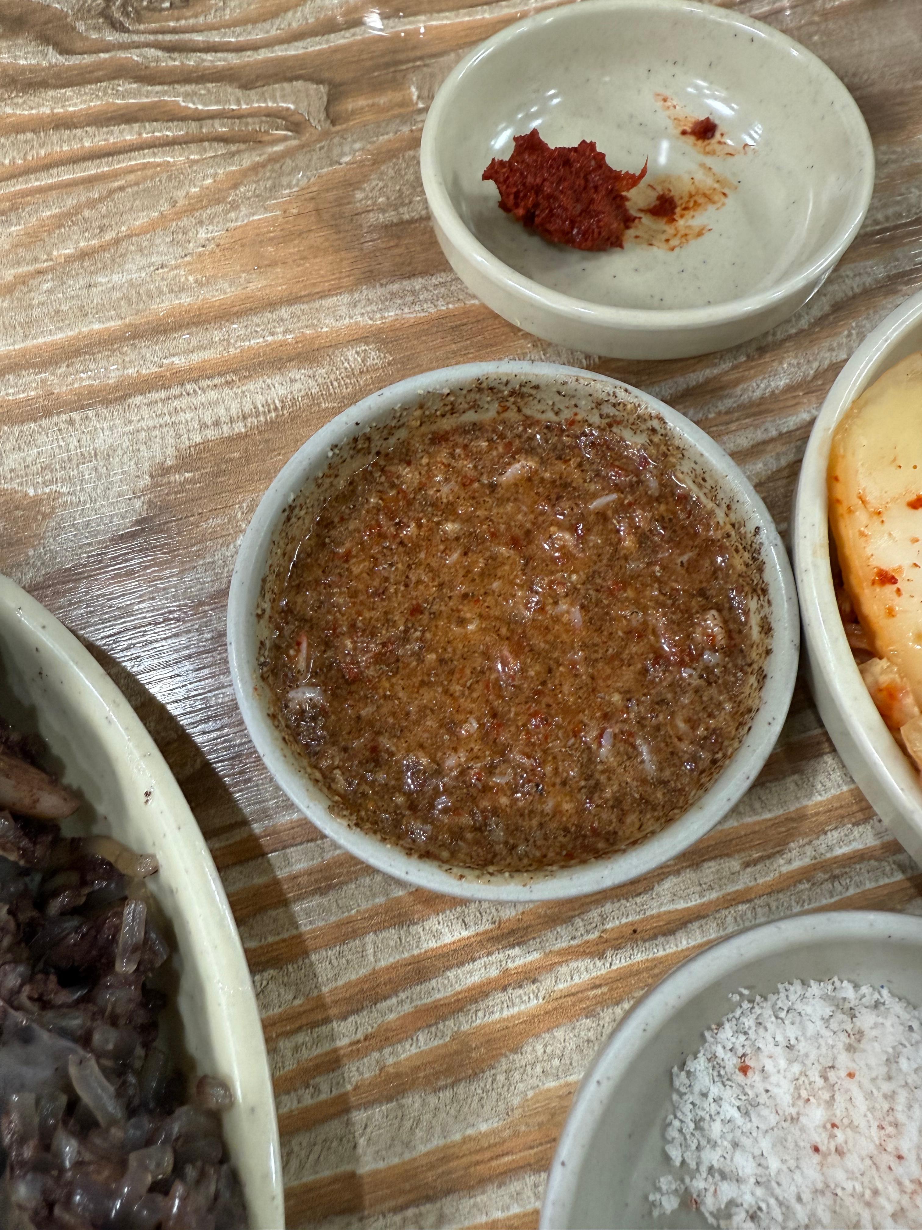 순대반접시는 순대와 간만 구성해 달라고 주문했어요. 소스는 어떤 분 하는 걸 보고 따라서 만들어 보았어요. 새우젓, 초장, 들깨, 다진 양념을 넣어서 만들었어요. 1인 1 국밥에 사이드로 순대반접시 정말 탁월한 선택이었어요.