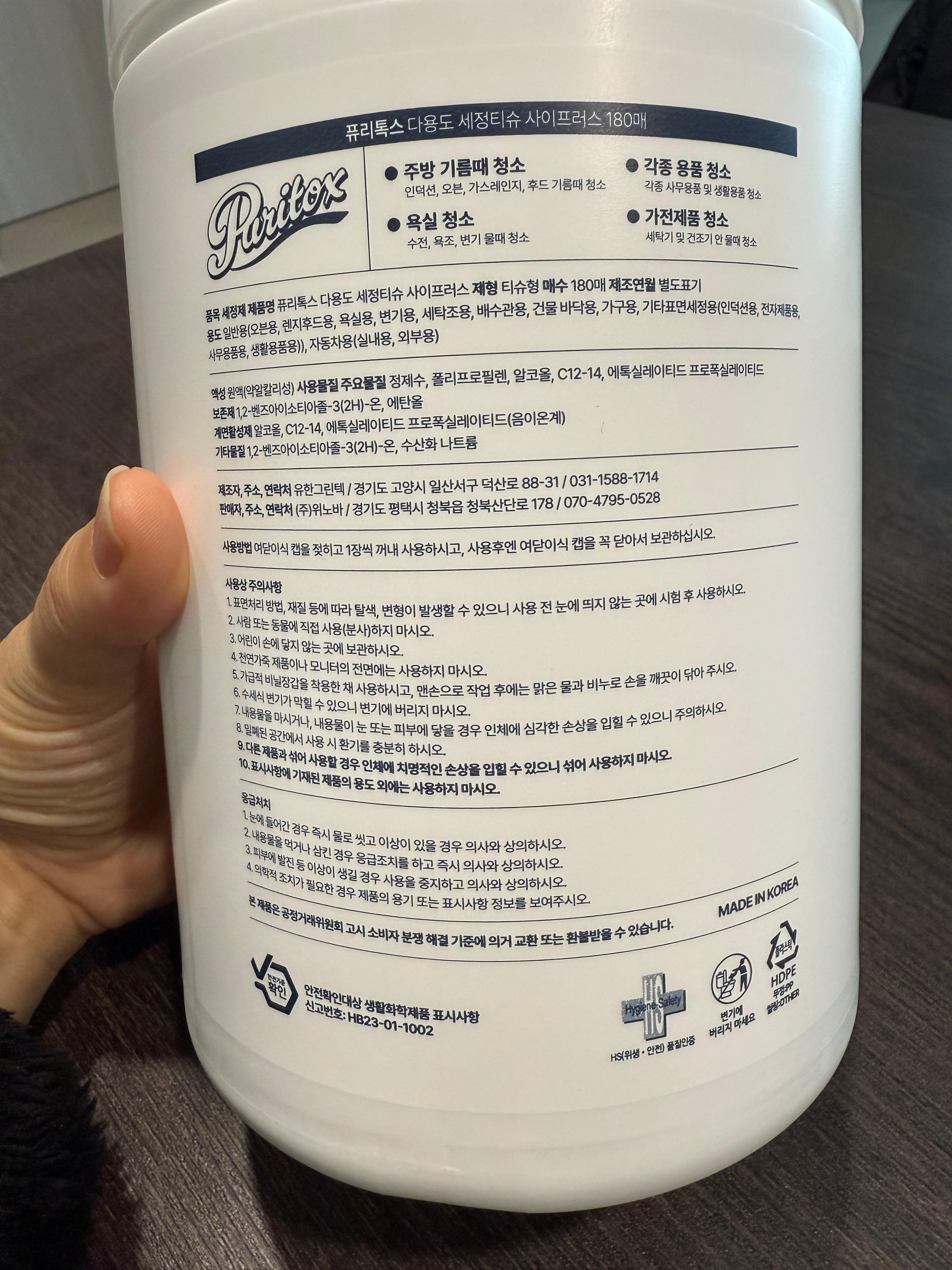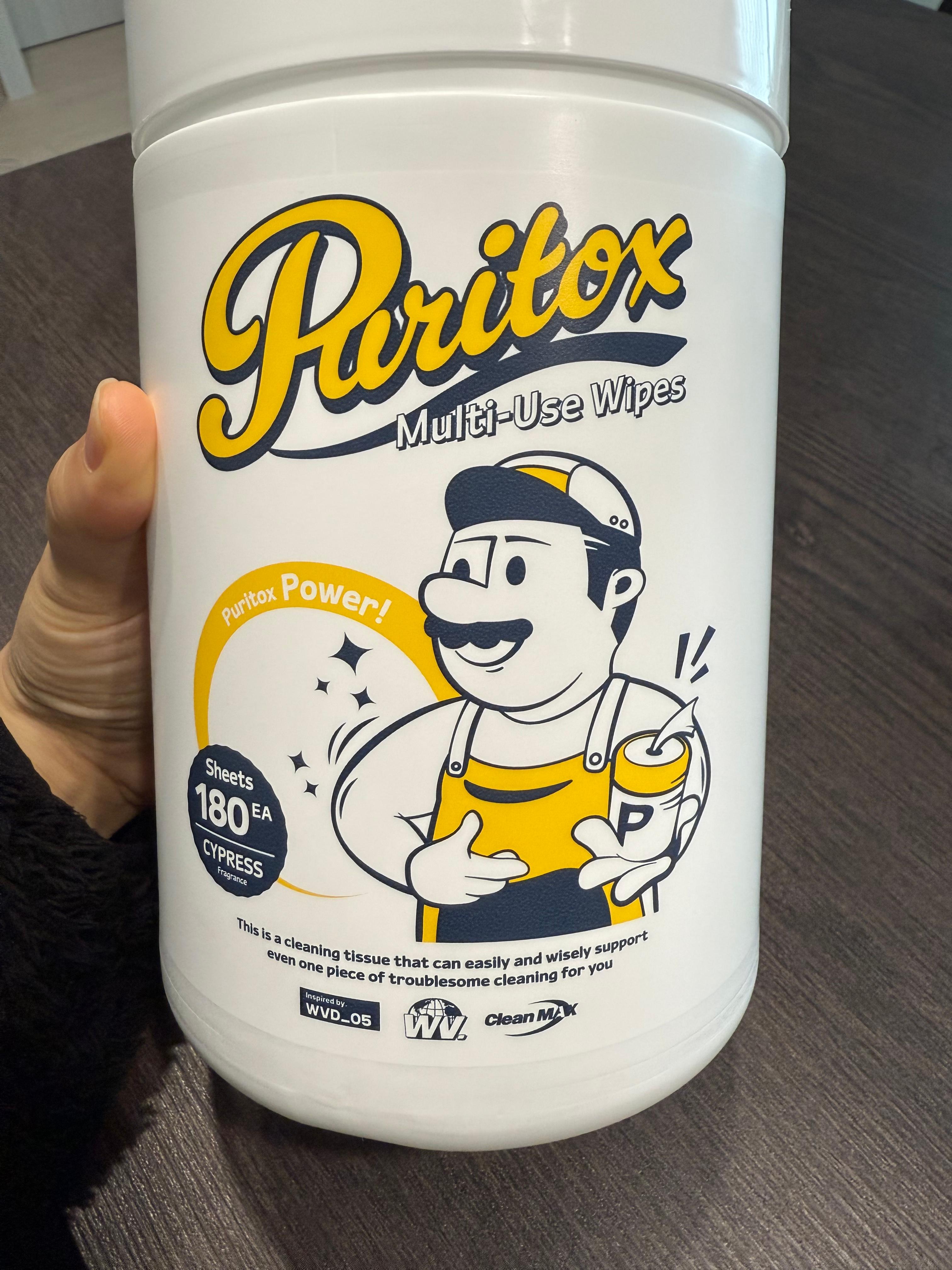 퓨리톡스 다용도세정티슈는 뚜껑이 있는 용기에 들어 있어요.