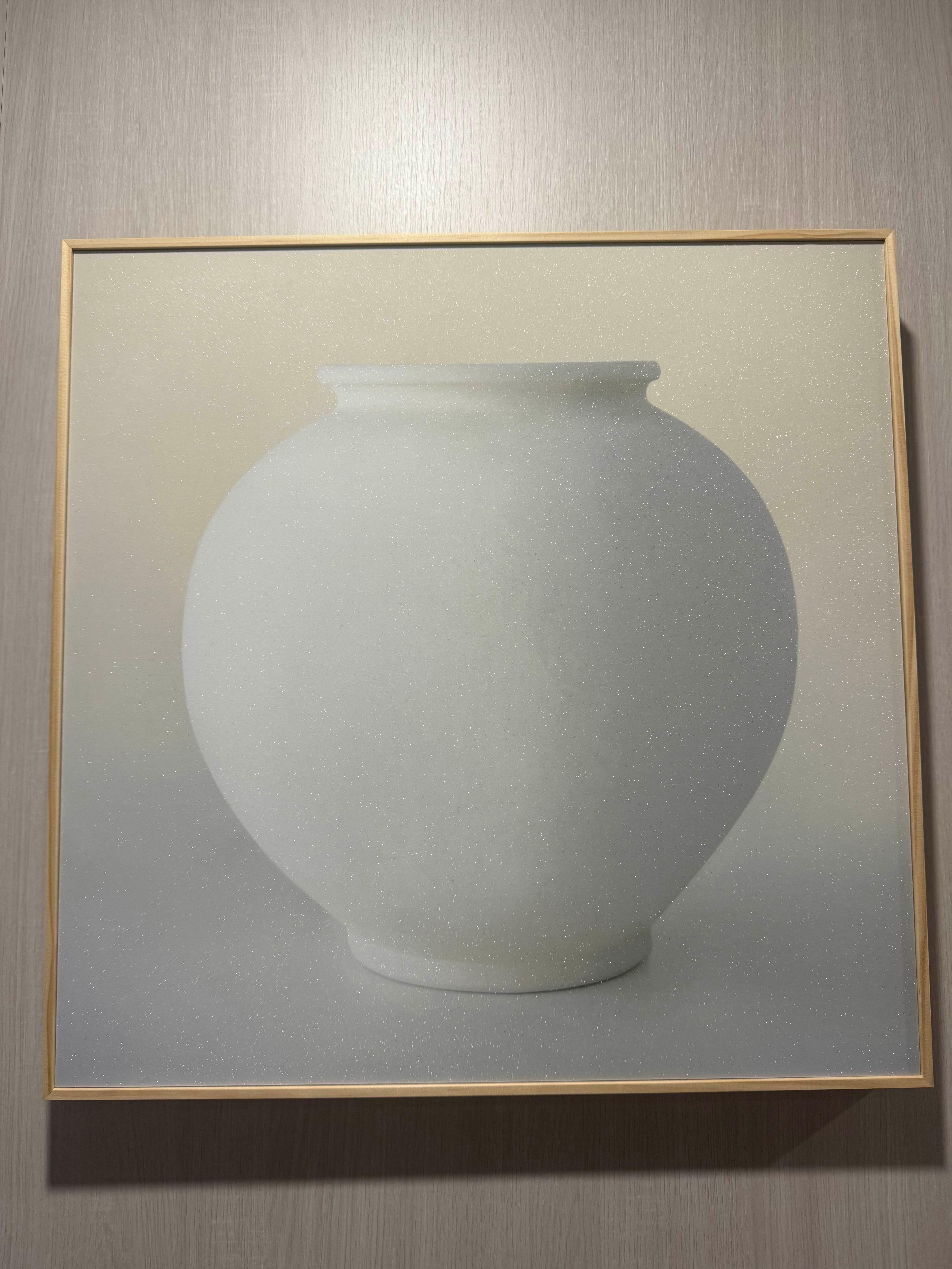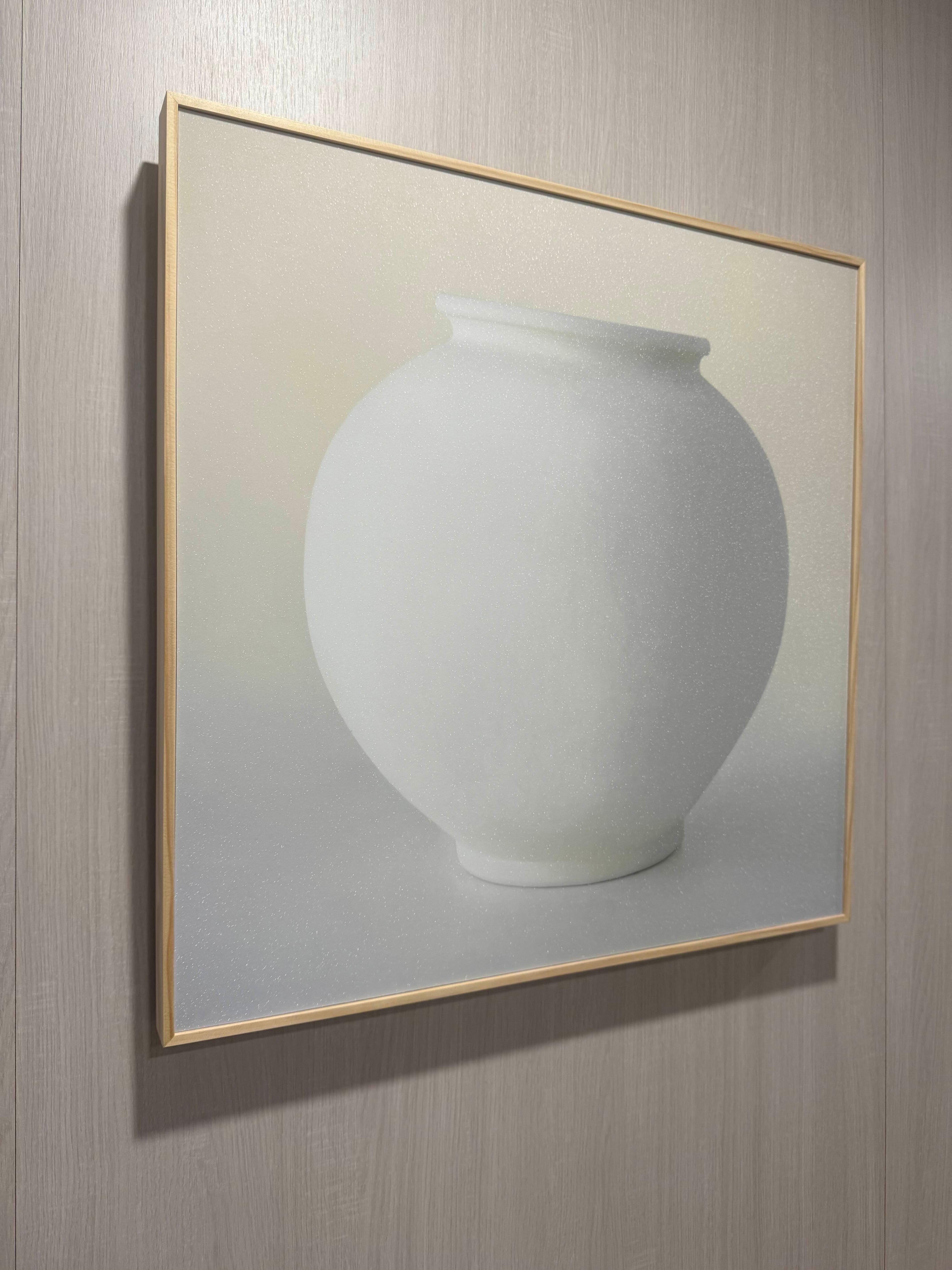 '기원'은 전통적인 달항아리의 형태를 현대적인 감각으로 재해석한 작품으로, 은은한 백색 바탕에 섬세한 붓터치가 인상적이에요. 단순하면서도 깊이 있는 표현이 마치 실제 달항아리가 발산하는 고요한 아름다움을 그대로 화폭에 옮겨놓은 듯해요.
