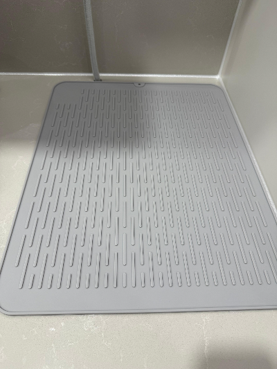 가까이서 보면 매트의 두께가 과하지 않아서 공간을 차지하지 않으면서도 안정감 있게 놓을 수 있어요. 바닥면은 매끄럽지만 미끄럼 방지 기능이 있어 조리대 위에서도 잘 밀리지 않아요.